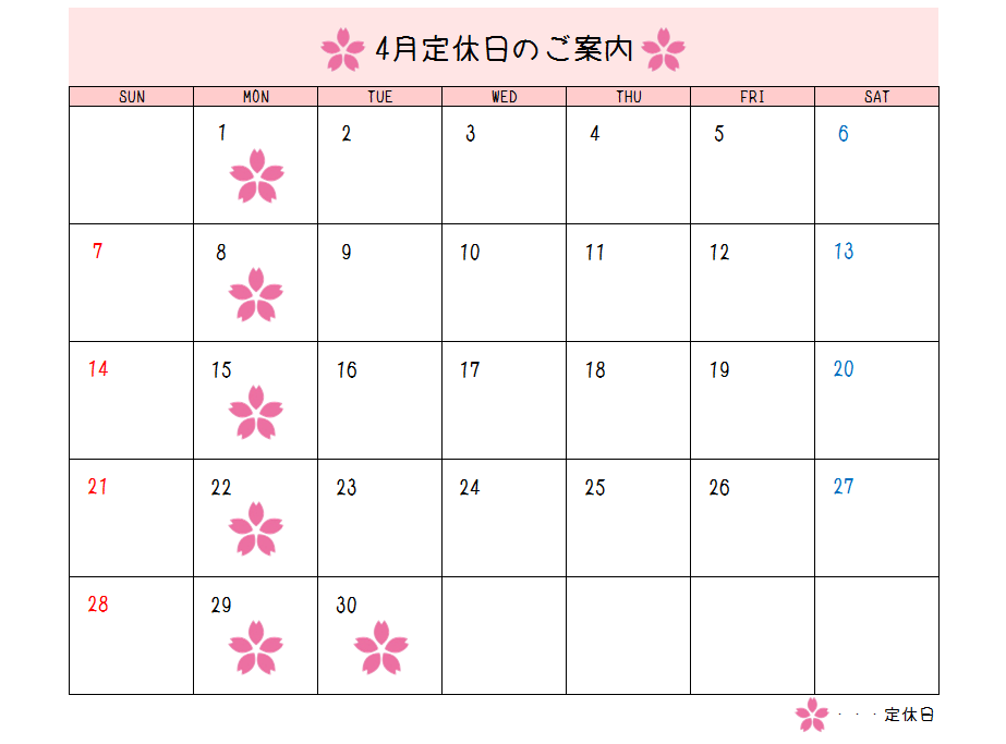 29日(月)よりGW休業に入りますので、30日(火)もお休みです。