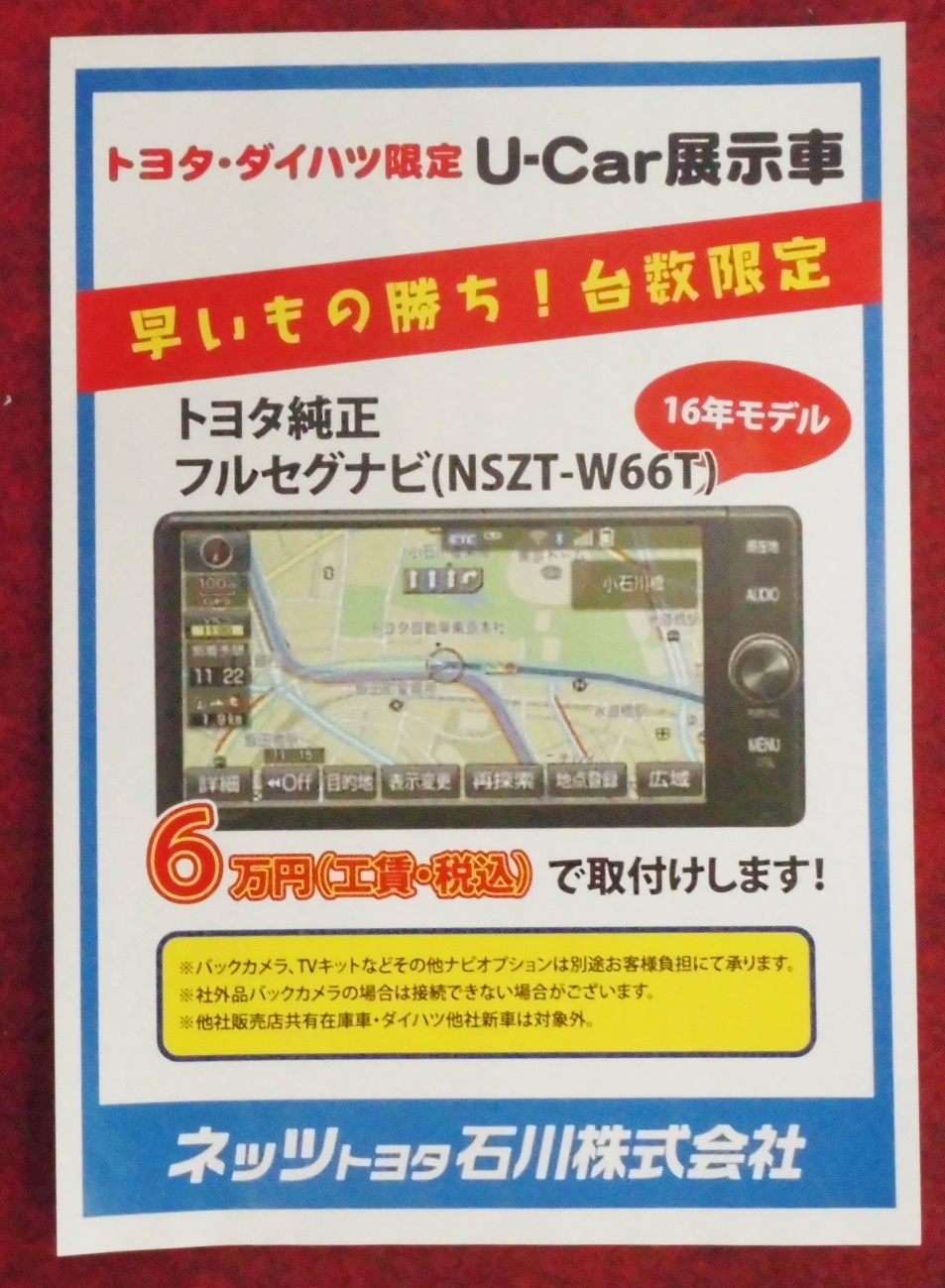 【U-Carシャンツェ七尾】早いもの勝ち!台数限定「トヨタ純正フルセグナビ」特別価格でご提供いたします!!