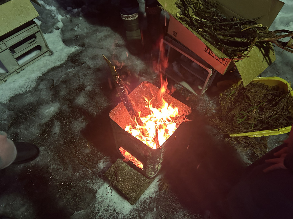 杉の葉(スンバっていいます)で暖をとります