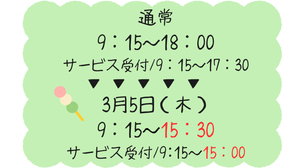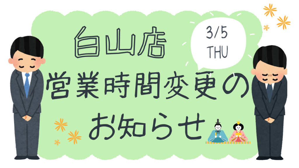 【白山店】3月5日(木)営業時間変更のお知らせ