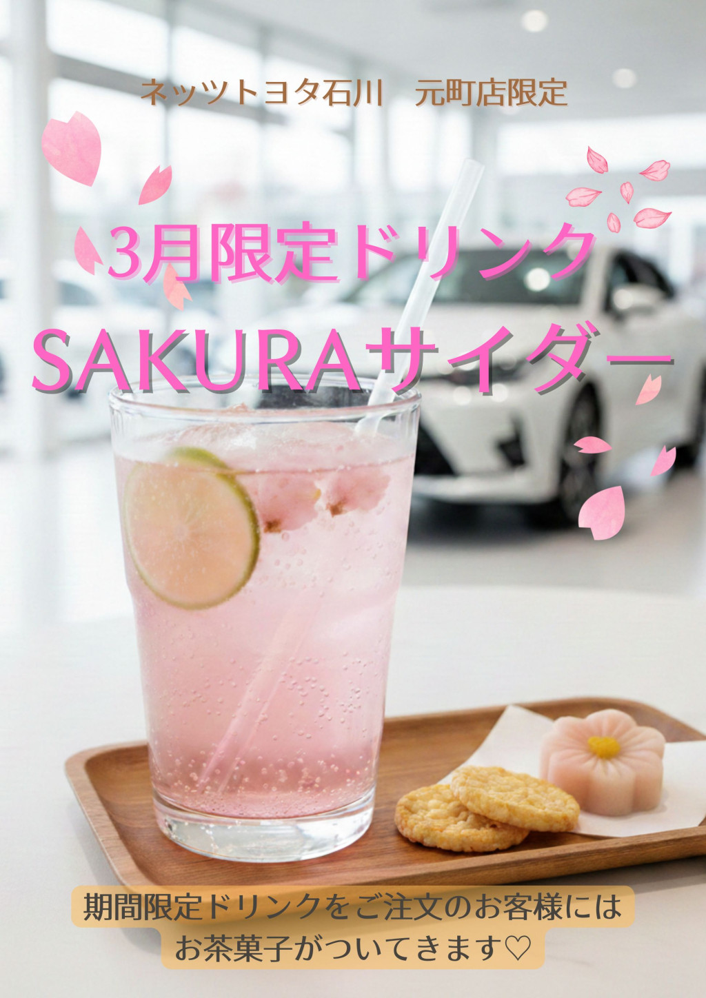 3月中に「桜サイダー」をご注文いただいたお客様には、ご一緒にお茶菓子を添えてご提供いたします。