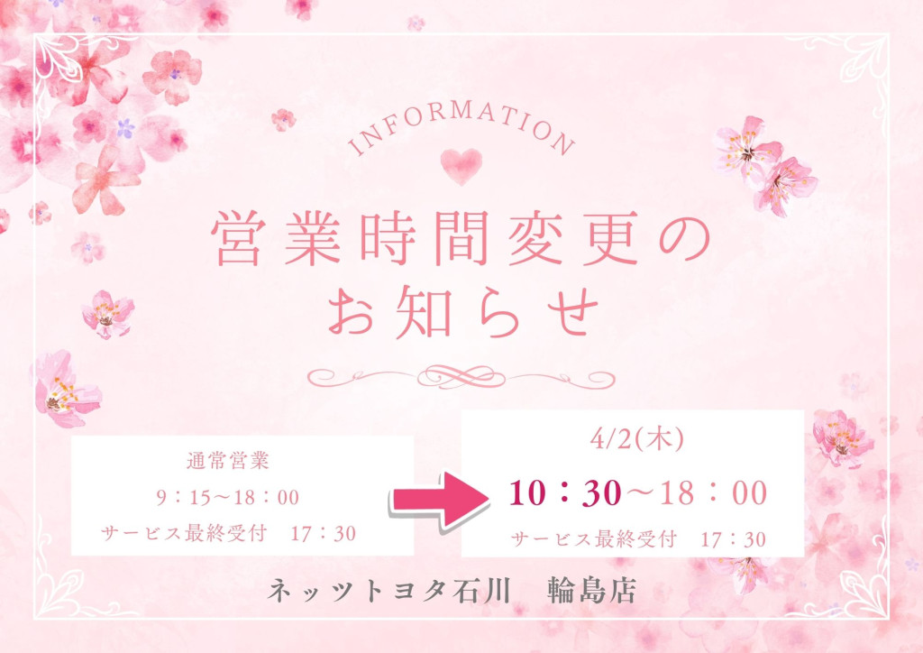 4/2(木)の営業時間変更のお知らせ 輪島店 2026.04.01 1 いつもあリがとうございます☺️ 輪島も少しずつ桜が咲いてきました☆ 4/2(木) の営業時間変更のお知らせです! 社内研修のため、営業時間を下記の通り変更させていただきます。 ご不便をおかけしますが、ご了承のほどよろしくお願いいたします ネッツトヨタ石川 輪島店 いいねする SHARE SHARE TWEET