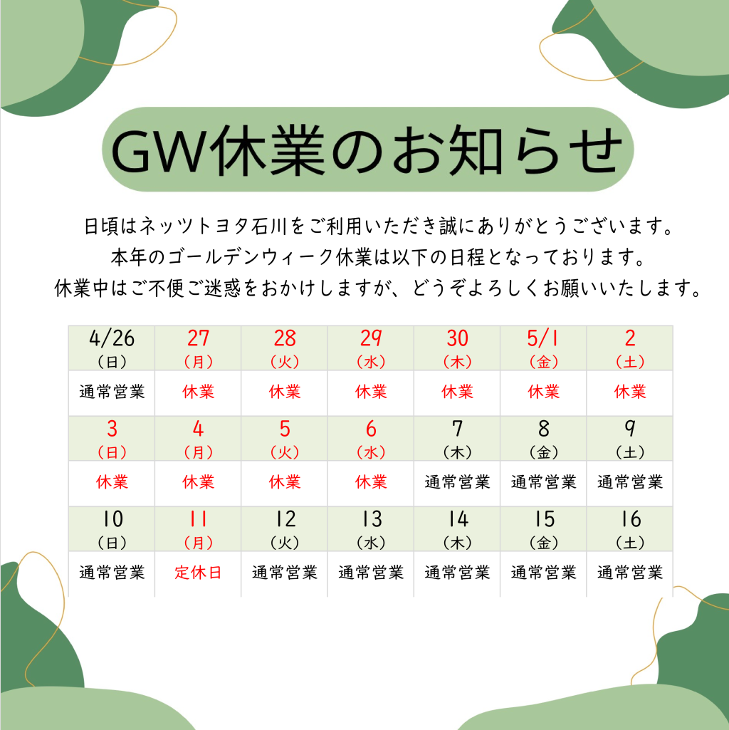 【津幡店】ゴールデンウイーク休業のお知らせ