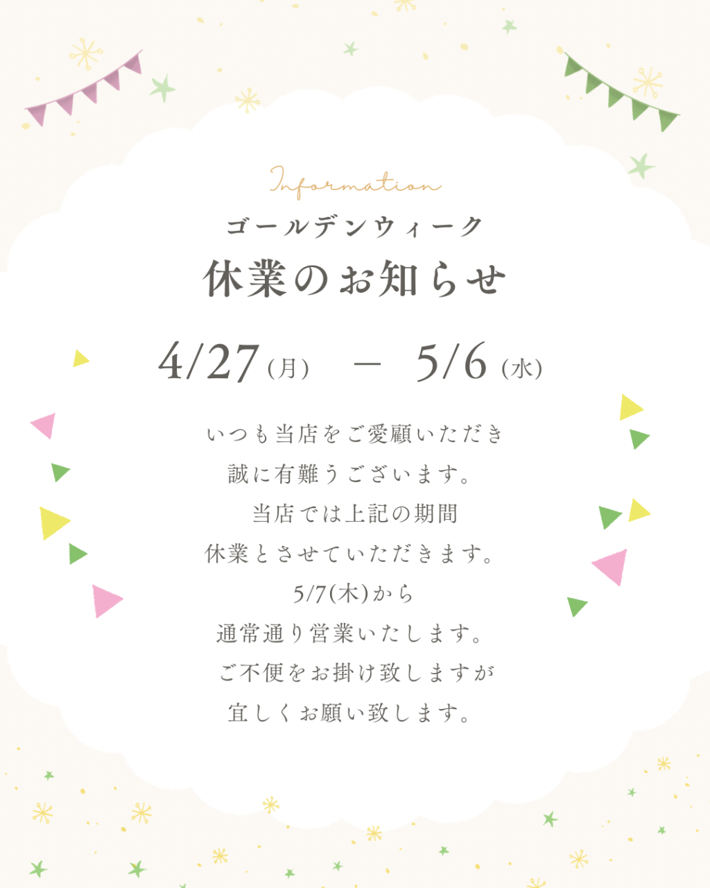 誠に勝手ながら、当店では下記の期間をゴールデンウィーク休業とさせていただきます。