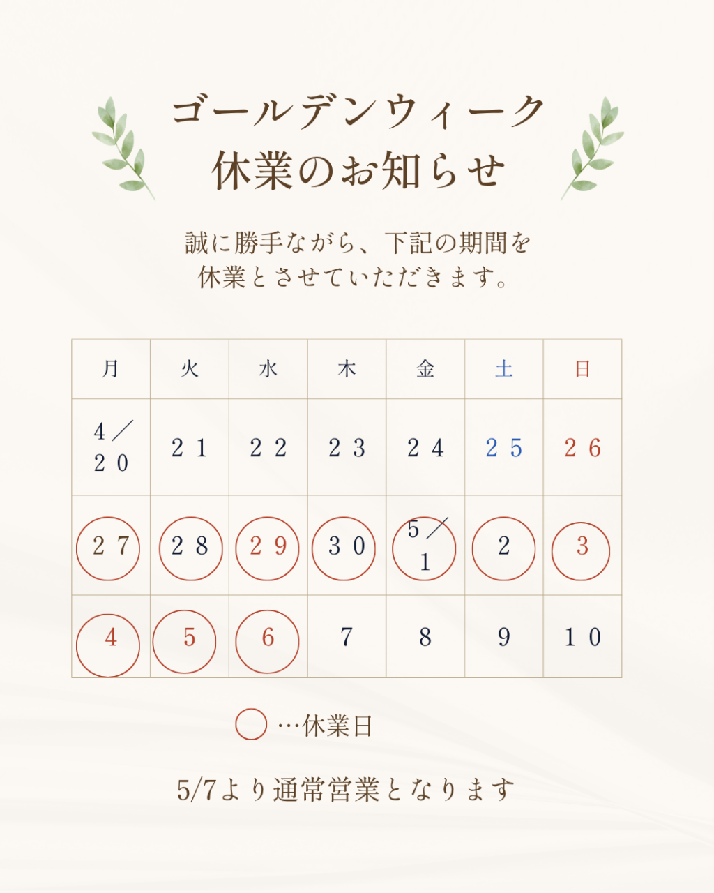 弊社のゴールデンウイーク休業は下記の日程とさせていただいております。